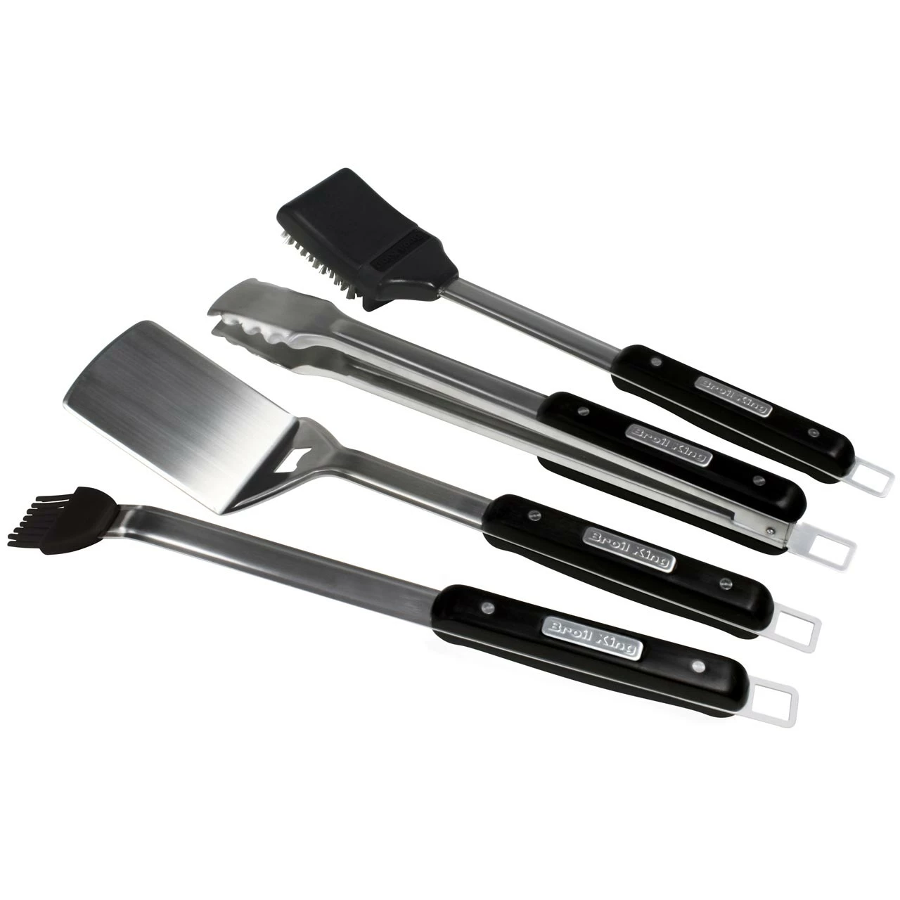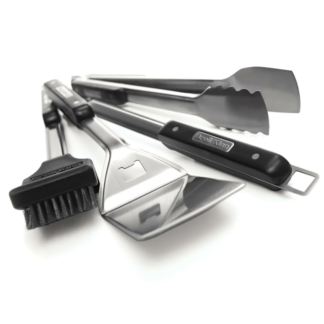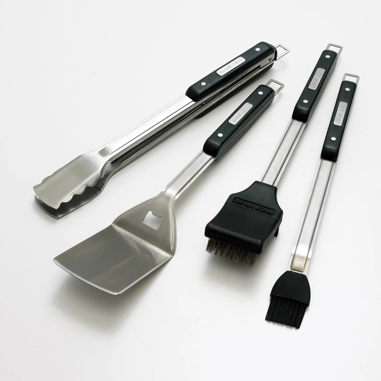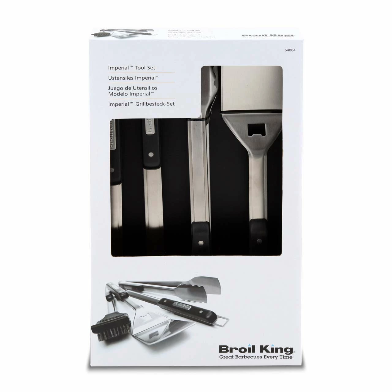 Das professionelle vierteilige Besteck-Set Imperial von Broil King ist das perfekte Set für anspruchsvolle Griller. Dieses bietet alles was Du benötigst und besteht aus einer Zange, einem Wender sowie einem Silikon-Pinsel und einer Reinigungsbürste mit wechselbarem Kopf (Edelstahlborsten). Das Werkzeug ist aus 1,8 mm dickem Edelstahl gefertigt und besitzt massive Kunststoffgriffe.