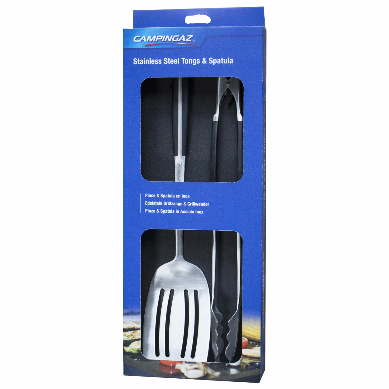 Mit dem Premium Starter Grillbesteck-Set von Campingaz bekommst Du die perfekten Utensilien für Deine Outdoorküche. Grillwender und Grillzange sind ein absolutes Must-Have, wenn Du Dich beim Grillen nicht verbrennen möchtest. Die langen Griffe aus Kunststoff sorgen dabei für den nötigen Abstand zu den Flammen. Die beiden Grillutensilien sind aus rostfreiem Edelstahl gefertigt. So kannst Du sie auch problemlos in der Spülmaschine reinigen.