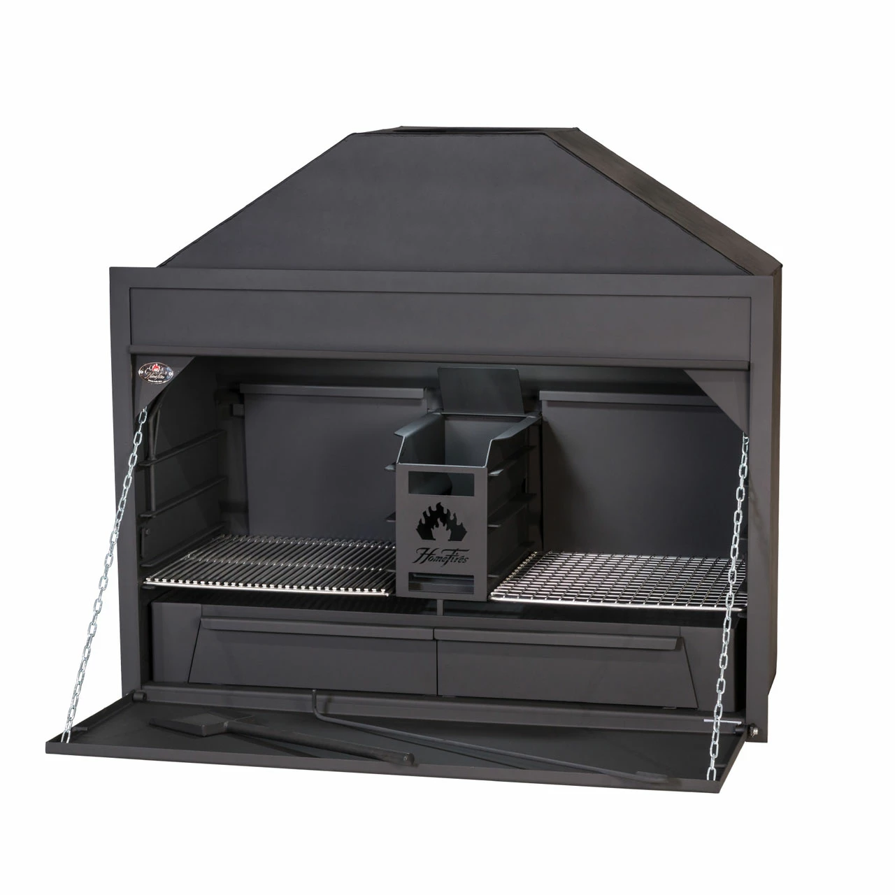 Unter der Glutwanne befindet sich ein Schacht, indem man Garen oder Backen kann, die Glut darüber regelt die Temperatur. Er kann aber auch wunderbar zum Warmhalten von Grillgut genutzt werden. Des Weiteren befindet sich eine Aufhängung für einen Dutch Oven im Grill und ein Edelstahlgrillrost ist ebenfalls im Lieferumfang enthalten. Es gibt mehrere Höhen, worauf das Rost abgelegt werden kann.