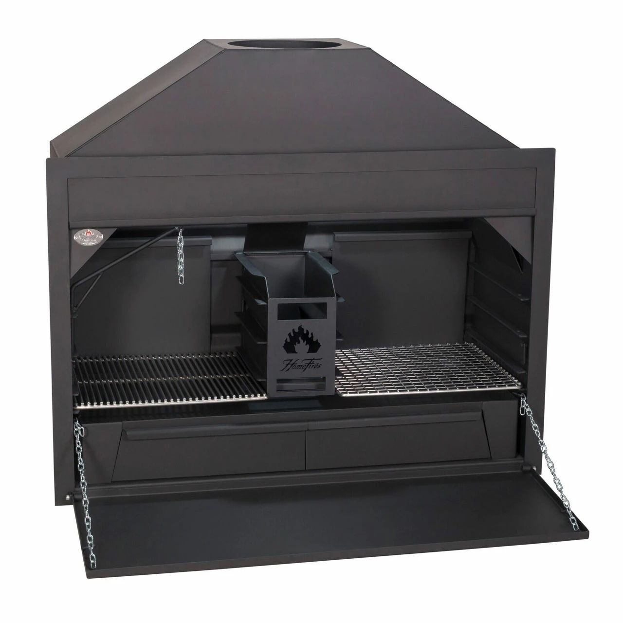 Der Built In 1200 fügt sich wunderbar in einer Ziegelwand mit ein und kann an einen isolierten Schornstein angeschlossen werden. Somit hat man das ganze Jahr eine schöne Koch- und Grillstelle, sowie ein schönes Ambiente, wenn man den Braai einfach als Kamin nutzen möchte.