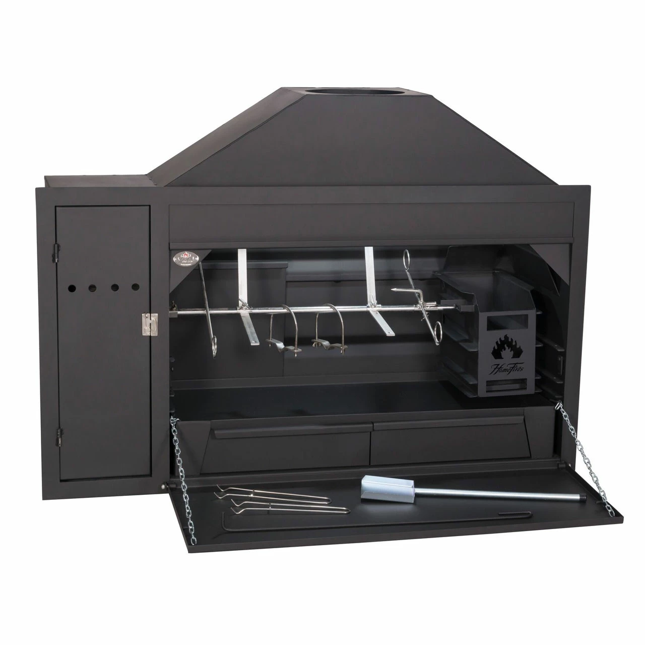 Ähnlich wie die Built In Grills, wird der Spitbraai in die Wand eingebaut und fügt sich wunderbar in einer Ziegelwand mit ein und kann an einen isolierten Schornstein angeschlossen werden. Somit hat man das ganze Jahr eine schöne Koch- und Grillstelle, sowie ein schönes Ambiente, wenn man den Braai einfach als Kamin nutzen möchte. Der Unterschied zum Built In liegt darin, dass der Spit mit einem Heavy Duty Motoreneinheit und einer Rotisserie geliefert wird. Um die zu verwenden, muss lediglich der Kohlemacher an die rechte Seite montiert werden und dann kann der Drehspieß angebracht werden. Die Grillroste müssen dafür entfernt werden.