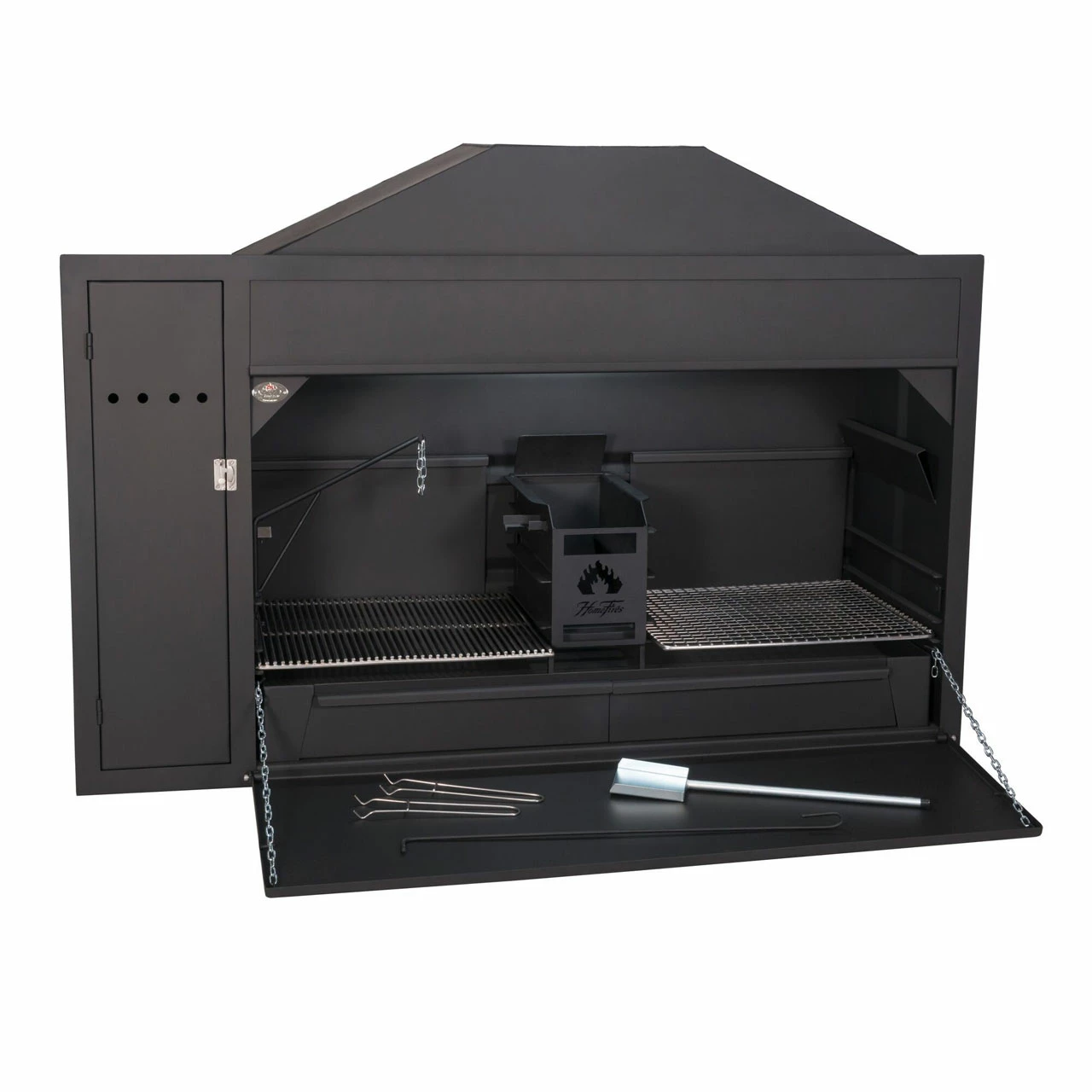 Unter der Glutwanne befindet sich ein Schacht, indem man Garen und Backen kann, die Glut darüber regelt die Temperatur. Er kann aber auch zum Warmhalten genutzt werden. Des Weiteren befindet sich eine Aufhängung für ein Dutch Oven im Grill und zwei Edelstahlgrillroste, ein Steakrost und ein normales, sind ebenfalls im Lieferumfang enthalten. Es gibt mehrere Höhen, worauf die Roste abgelegt werden können.