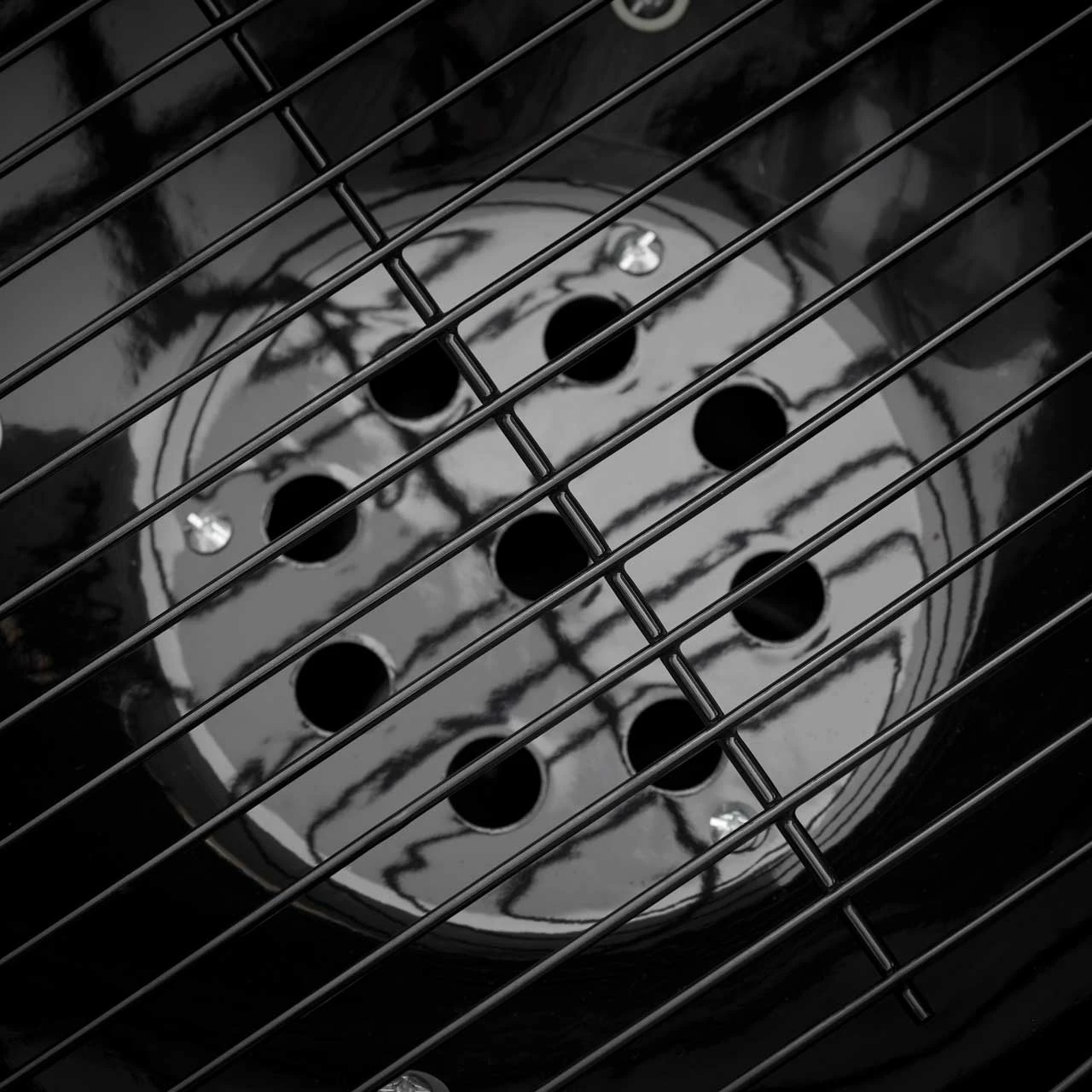 Die Ablage unter den Grill kann als Lagerfläche von Holzkohle verwendet werden. Der Grill besitzt zwei Standbeine und zwei Beine mit Gummi überzogenen Rollen, so kannst du den Grill dorthin schieben, wo er gerade benötigt wird.