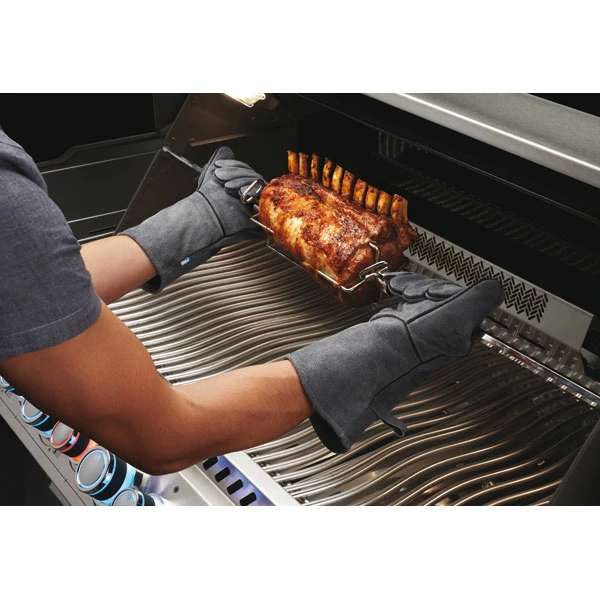 Mit den Grillhandschuhen von Napoleon® sind Deine Hände ideal vor der Hitze geschützt! So kannst Du ohne Probleme einen Drehspieß aus der Halterung nehmen oder auch eine heiße Gussplatte anfassen. Das graue Rindsleder wurde extra verstärkt, um Dir einen besseren Schutz zu gewährleisten. Sie haben eine perfekte Passform für mehr Fingerfertigkeit. Die Handschuhe sind aus Echtleder gefertigt und auf der Oberseite mit dem Napoleon®-Logo versehen.