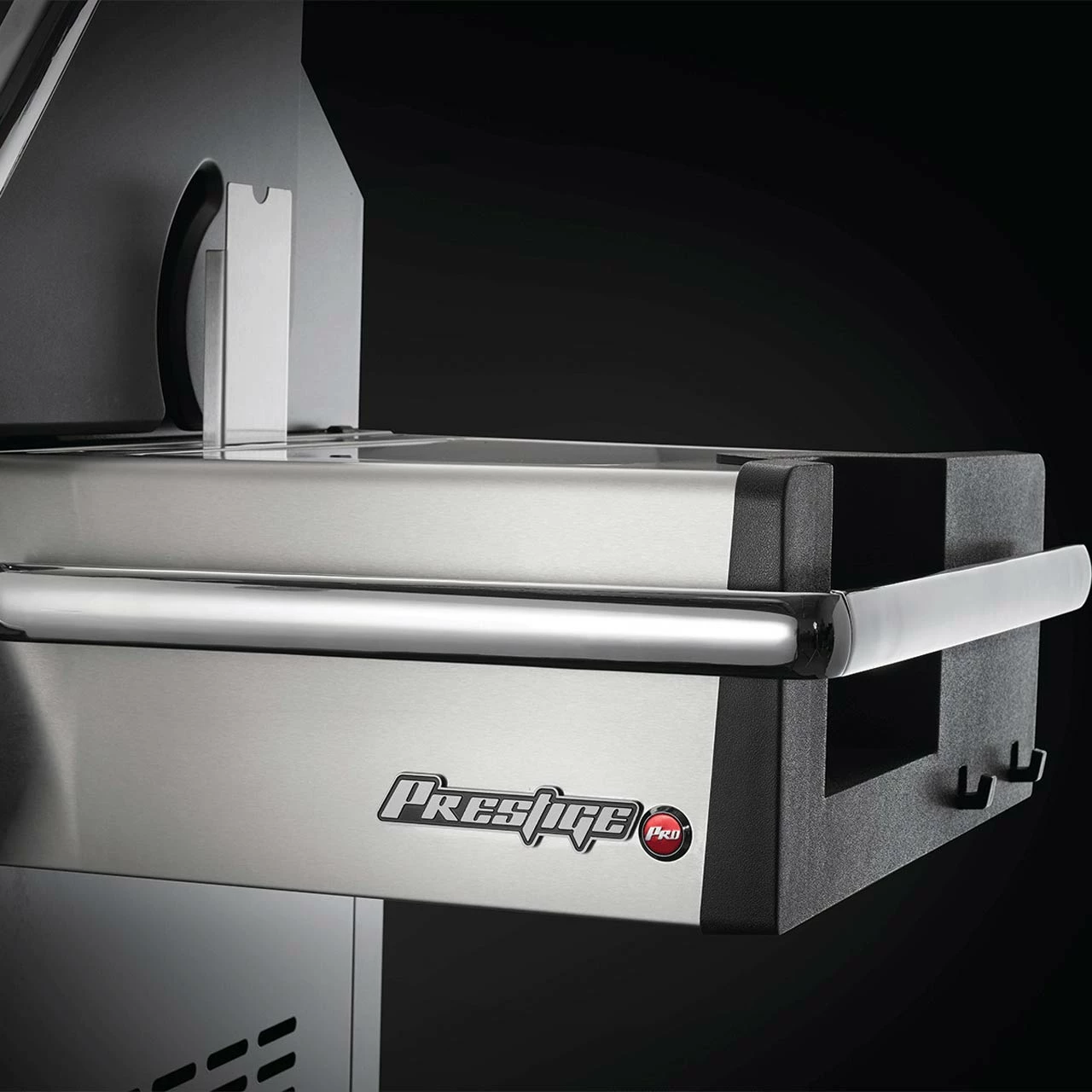Die Seitenablagen bieten reichlich Abstellfläche, damit Du nicht ständig in die Küche zurück rennen musst. Selbst Dein Grillwerkzeug findet an den Aufhängungen Platz. Ein weitere Unterschied zum normale Prestige sind die verchromten Handtuchhalter um alle drei Seiten der Ablagen. Zudem haben sie auf beiden Seiten einen Getränkehalter und auf der rechten Seite ein Eis- / Marinaden Fach mit Schneidebrett.