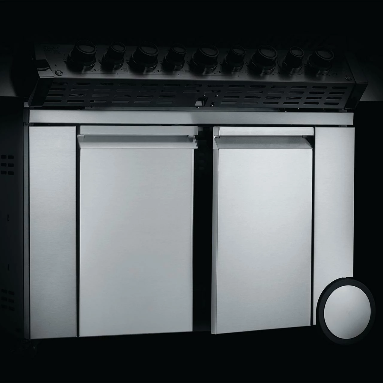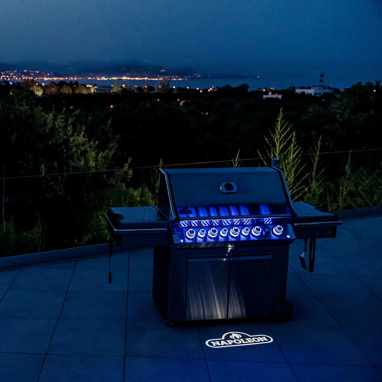 Das Edelstahl-Design begeistert durch modernes und zeitloses Design. So macht der Prestige PRO™ 665 auf jeder Terrasse oder jeden Balkon eine gute Figur. Die Brenner sind über beleuchtete SAFETY GLOW™ Drehregler und einen zweistufigen Hitzeverteilersystem steuerbar. Mit SAFETY GLOW™ hast Du nicht nur verschieden farbige Bedienelemente, sondern auch eine Innenbeleuchtung für stilvolles Grillen bei Nacht. Ein weiteres Feature was den normalen Prestige vom PRO™ Modell unterschiedet, ist die bewegungsaktivierende Bodenprojektion des Napoleon® Logos und die dickeren Roststäbe, statt der normalen 7 mm, sind die Stäbe beim Rost 9,5 mm dick.
