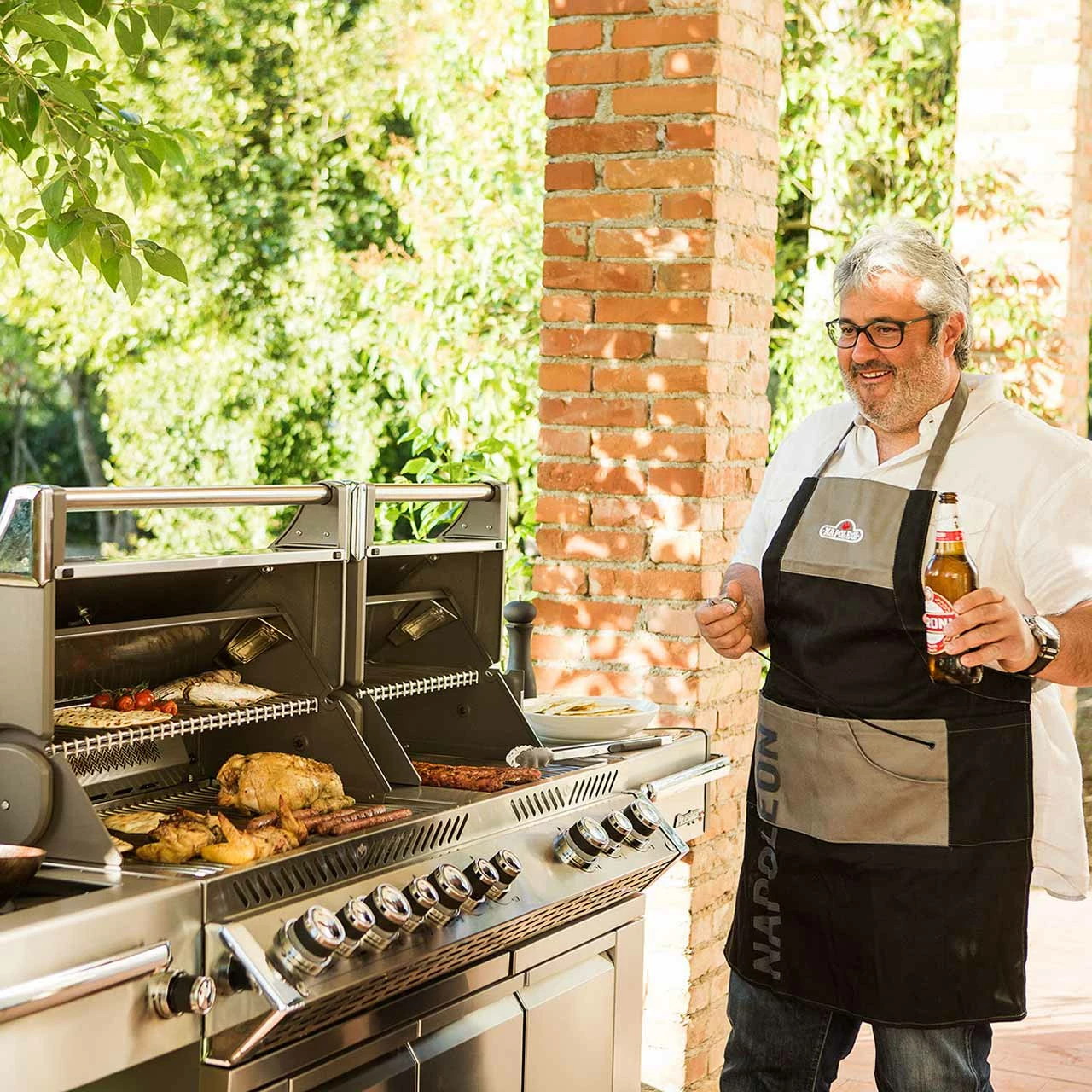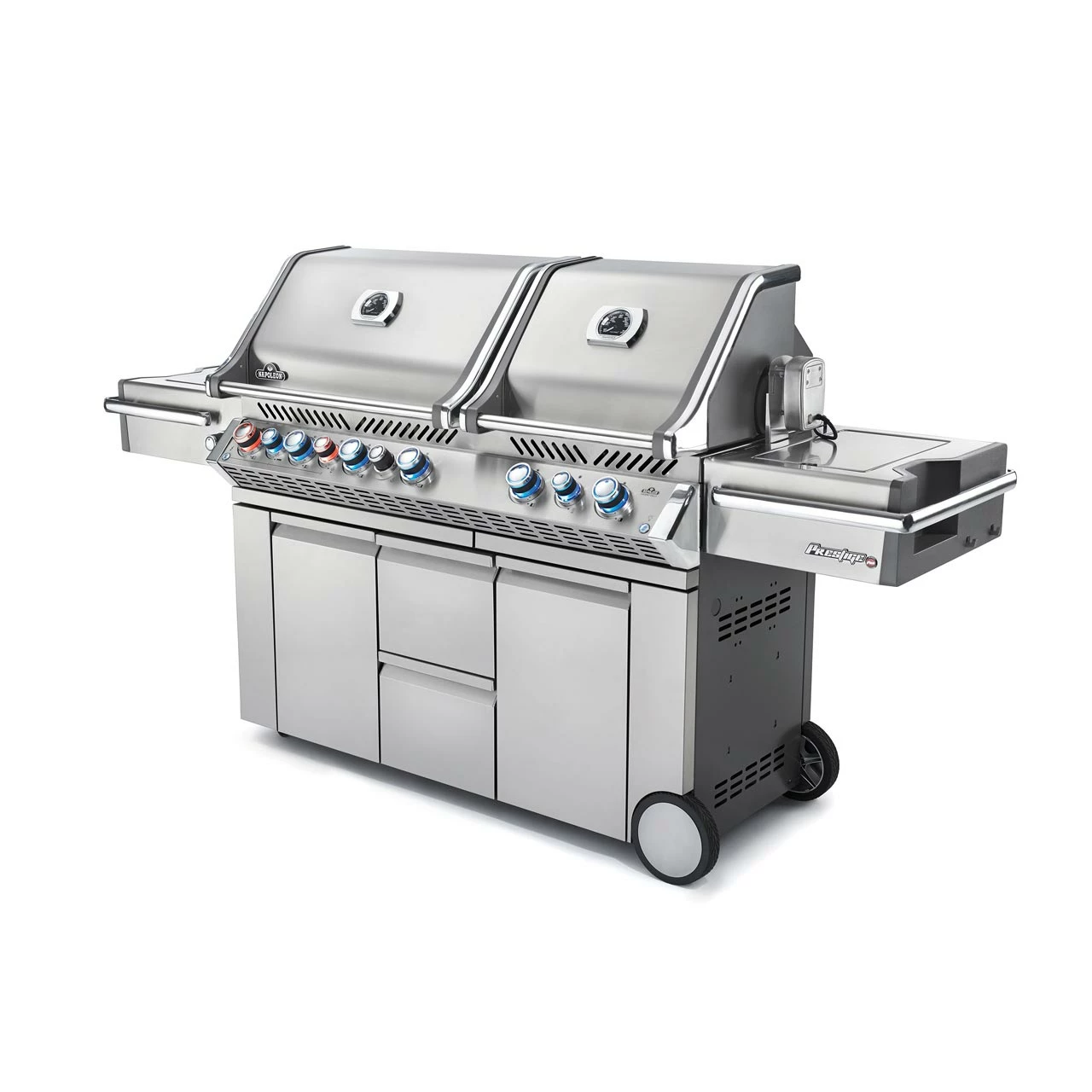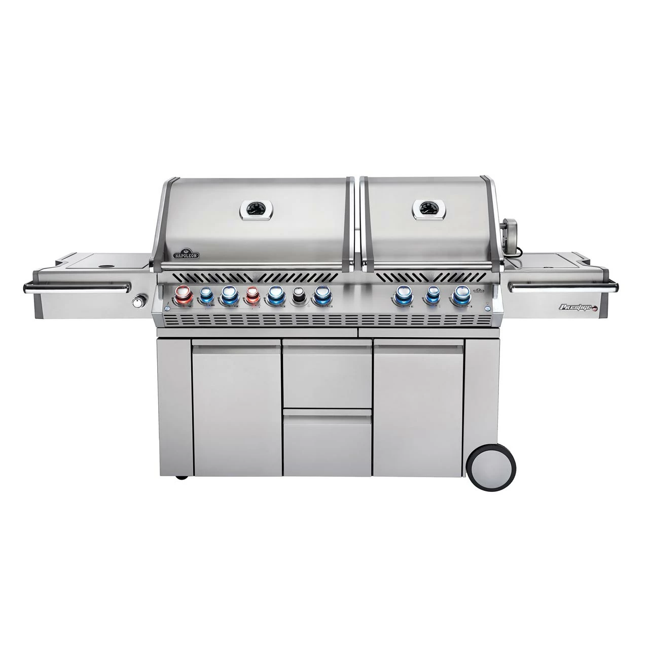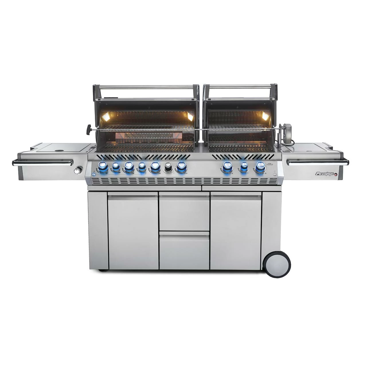 Die hochwertige Edelstahl-Optik mit Chrom-Akzenten begeistert durch modernes und zweitloses Design. So macht der Prestige PRO™ 825 auf jeder Terrasse eine gute Figur. Die Brenner sind über beleuchtete SAFETY GLOW™ Drehregler und einem zweistufigen Hitzeverteilersystem aus Edelstahl steuerbar. Mit SAFETY GLOW™ besitzt Du nicht nur verschiedenfarbige Bedienelemente, sondern auch eine Innenbeleuchtung in den Grillkammern, Unterschränken und Schubladen für stilvolles Grillen bei Nacht. Ein weiteres Feature ist die bewegungsaktivierende Bodenprojektion des Napoleon® Logos und die dickeren Roststäbe, welche statt der normalen 7 mm eine Dicke von 9,5 mm besitzen.