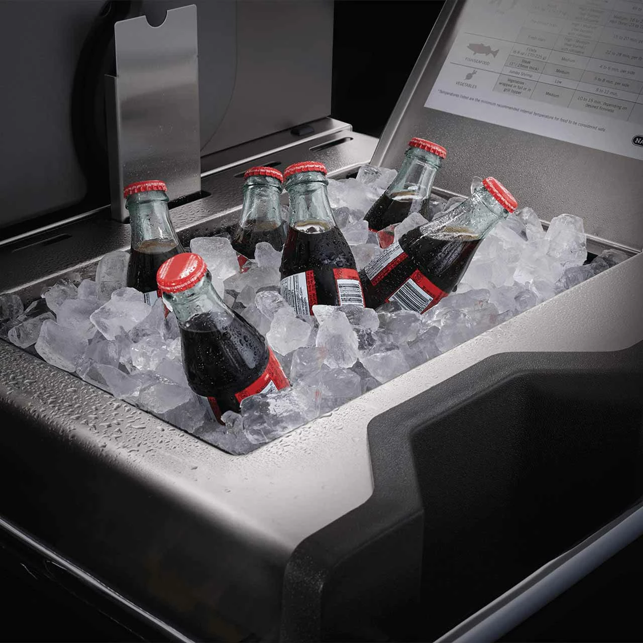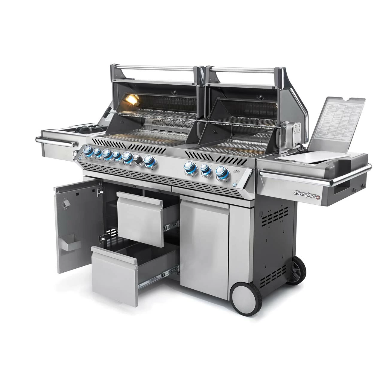 Die Seitenablagen bieten reichlich Abstellfläche, damit Du nicht ständig in die Küche zurück rennen musst. Selbst Dein Grillwerkzeug findet an den Aufhängungen Platz. Ein weitere Unterschied zum normale Prestige sind die verchromten Handtuchhalter um alle drei Seiten der Ablagen. Zudem haben sie auf beiden Seiten einen Getränkehalter und auf der rechten Seite ein Eis- / Marinaden Fach mit Schneidebrett.
