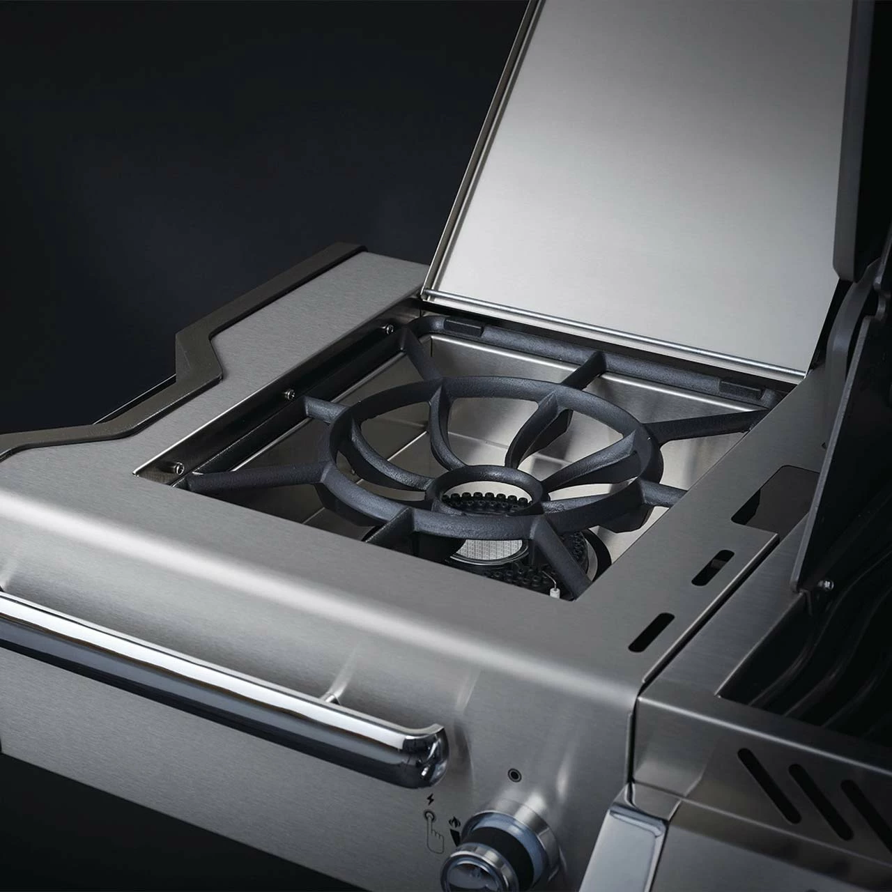 Was sofort ins Auge springt sind die beiden Grillhauben unter der sich einmal die Hauptgrillfläche mit 72 x 46 cm befindet und eine SIZZLE ZONE™ Area mit nicht nur einer, sondern gleich zwei Zonen mit einer Größe von 47 x 46 cm. Die Area hat zusätzlich eine extra Brenner zum Warmhalten von Grillgut. Dazu kommt noch der Infrarot-Heckbrenner für Gerichte vom Drehspieß, aber um den richtig nutzen zu können, brauch man schließlich auch einen Drehspieß und das ist bei dem Prestige PRO™ 825 der Fall! Das passende Drehspieß-Set mit Moter ist inklusive! Aber das ist immer noch nicht alles. In der linken Seitenablage befindet sich der innovative Power-Seitenbrenner mit zwei Leistungsstufen: ein runder zentraler Infrarotbrenner mit Durchmesser Ø 25 sowie ein äußerer Brenner für vielfältige Grillmethoden und ein beidseitig verwendbarer Grillrost aus Gusseisen für die Verwendung eines Woks oder Topfes. Dadurch hast Du die Kapazitäten für bis zu 25 Personen zu grillen und bist für jegliche Grill-Eventualitäten gerüstet! Das praktische Warmhalterost hilft Dir zusätzlich in mehreren Etappen zu grillen. Somit muss keiner Deiner Gäste leer ausgehen.