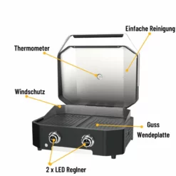 Cozze Plancha 600, 2 Brenner, 6,4kW Inkl. Druckminderer Und Schlauch, Gussplatte + Schickes Zubehör