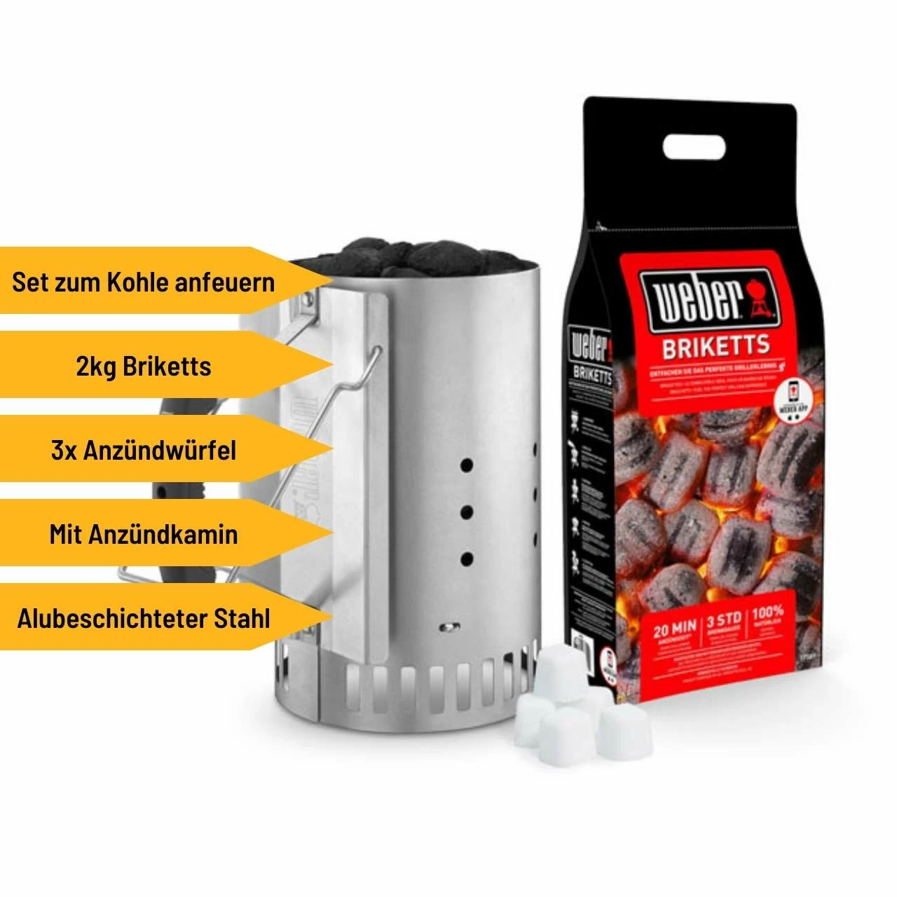Das 3-in-1-Anzünd-Set von Weber enthält alles, was Du als Holzkohlegriller benötigst. Mit diesem Starterpaket bekommst Du einen 2-kg-Sack mit den neuen Weber-Briketts, drei Anzündwürfel sowie den Rapidfire Anzündkamin von Weber. Der Rapidfire besteht aus aluminiumbeschichtetem Stahl und besticht vor allem durch seine hervorragende Heizleistung, die Deine Briketts oder Holzkohle im Handumdrehen durchheizen lässt.