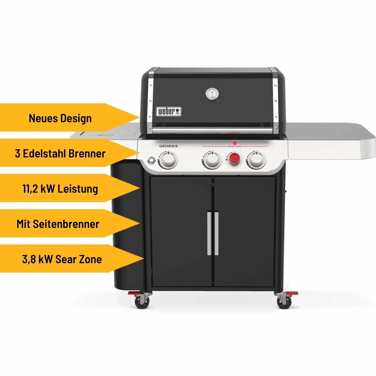 Das neuste Modell von Weber verfügt über 3 Edelstahl-Brenner mit einer Brennerleistung von 11,4 kW. Mit der Sear Zone holst Du Dir ein Hochleistungshitzesystem nach Hause, mit dem Du die perfekten Röstaromen bei ultimativem Geschmack und maximaler Temperatur bekommst. Durch die gleichmäßig-intensive Hitze bekommst Du so zudem schöne Brandings auf Dein Grillgut. Die Flavorizer Bars aus Edelstahl – Aromaschienen – verteilen die Hitze der heißen Flamme gleichmäßig und schützen gleichzeitig Dein Fleisch vor dem direkten Flammenkontakt. Zusätzlich verfügt der Grill über eine Seitenkochstelle. Mit dieser kannst Du sautieren, Wasser kochen oder auch Saucen erwärmen. So hast Du eine weitere Zubereitungsmöglichkeit, um Deine Gäste zu verzaubern.