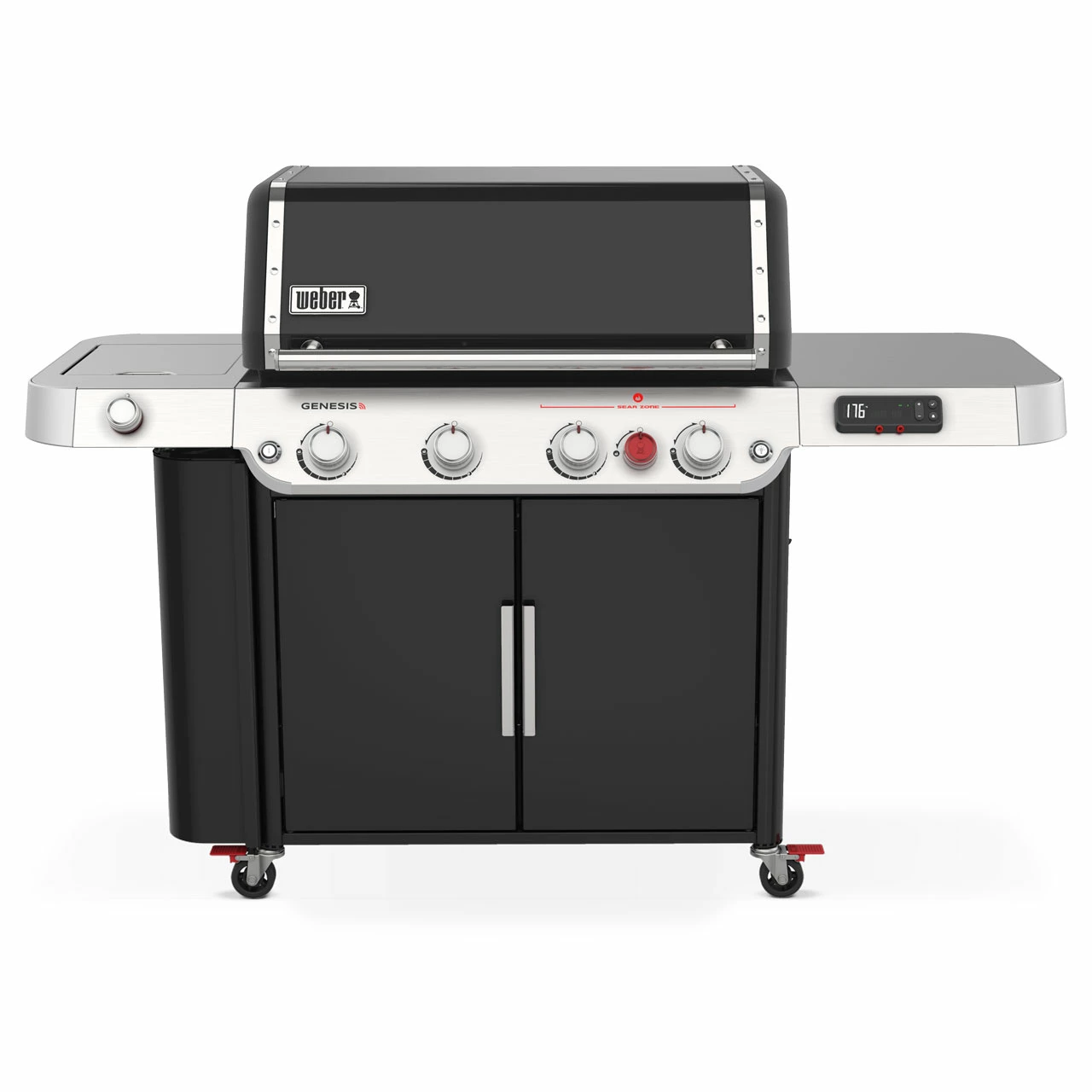 Der smarte Weber-Grill überzeugt durch seine 4 Edelstahl-Hauptbrenner mit einer Brennerleistung von 14,1 kW. Mit der Sear Zone holst Du Dir ein Hochleistungshitzesystem nach Hause, mit dem Du die perfekten Röstaromen bei ultimativem Geschmack und maximaler Temperatur bekommst. Durch die gleichmäßig-intensive Hitze bekommst Du so zudem schöne Brandings auf Dein Grillgut. Die Flavorizer Bars aus Edelstahl – Aromaschienen – verteilen die Hitze der heißen Flamme gleichmäßig und schützen gleichzeitig Dein Fleisch vor dem direkten Flammenkontakt. Zusätzlich verfügt der Grill über eine Seitenkochstelle. Mit dieser kannst Du sautieren, Wasser kochen oder auch Saucen erwärmen. So hast Du eine weitere Zubereitungsmöglichkeit, um Deine Gäste zu verzaubern. Damit Du auch im dunkeln problemlos arbeiten kannst sind alle Bedienknöpfe beleuchtet und verfügen über die Weber LED-NIGHT VISION Grillbeleuchtung. So wird die ganze Grillfläche beleuchetet und Dir kann nichts im Dunkeln anbrennen.