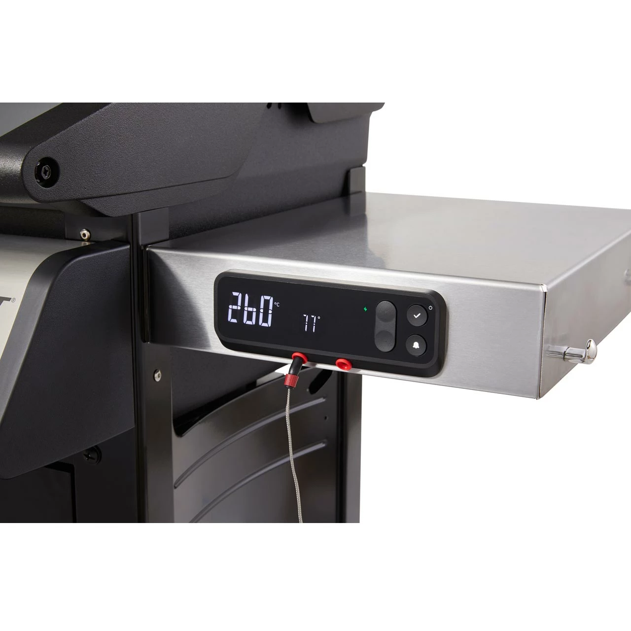 Das Weber Connect ist im Seitentisch integriert und kommt mit einem Fleisch Thermometer inklusive. Dadurch kriegst Du digitale Temperatur- und Garstufen-Countdowns in Echtzeit auf Deinem Smartphone, oder wird auf dem Display am Grill angezeigt. Der Fühler ist im Garraum integriert, Du hast aber auch die Möglichkeit zwei weitere Messfühler anzuschließen.