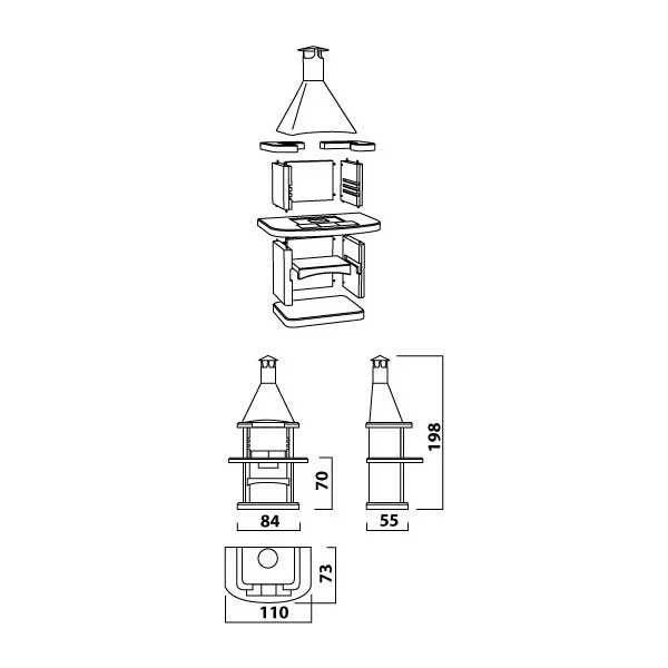 Der Alegra hat eine Edelstahlhaube und eine graue Granitplatte vor dem Feuerraum. Die Boden und Arbeitsplatte, sowie die Gesimsplatte sind Terrakottafarben. Die Oberfläche besteht aus feinem Natur-Splitt. inkl. Keramikfliesen in der Arbeitsplatte.