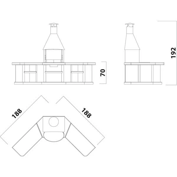 Die Arbeitsplatten sind schräge zugeschnitten. Die Ardea Außenküche wird über einen Winkel von 90 Grad aufgebaut. Die Oberfläche besteht aus weißem feinem Natursplitt 1-3mm Körnung.